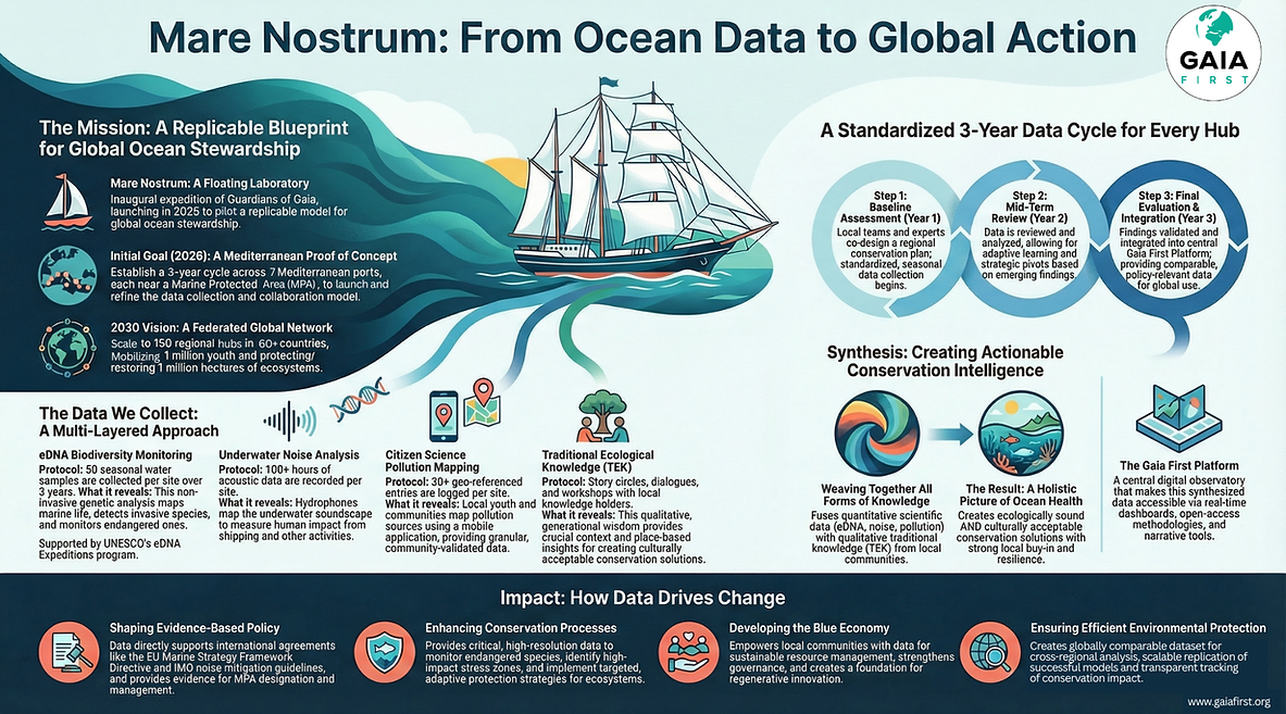 Through standardized field protocols deployed during expeditions such as Mare Nostrum and sustained by local institutions, hubs generate high-quality, comparable environmental data — from biodiversity (eDNA) and underwater noise to pollution and restoration indicators — while integrating Traditional Ecological Knowledge under prior informed consent.